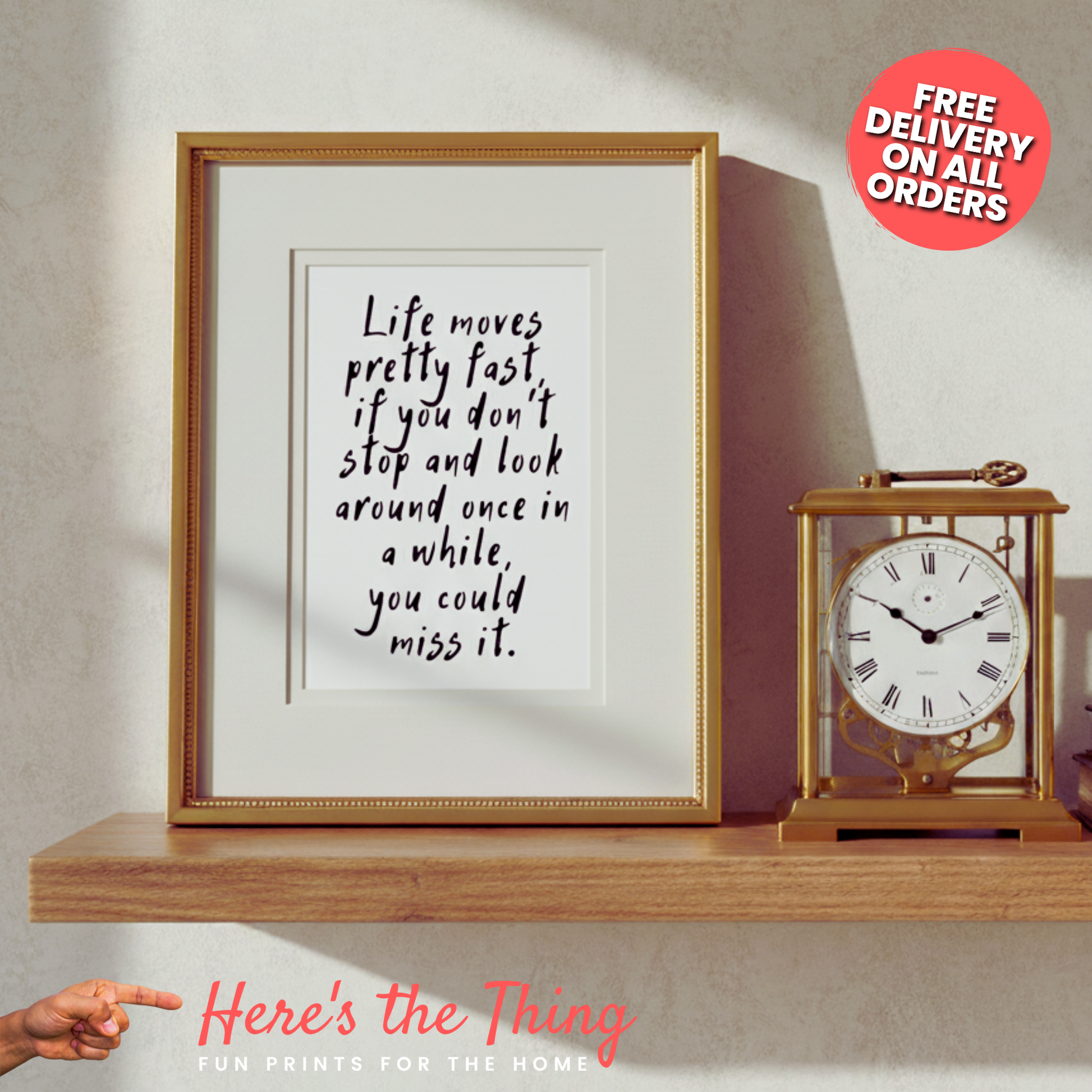 Whether you're decorating your own home or searching for the perfect gift that your friends and family will love, the 'Life Moves Pretty Fast' print is the ideal choice to enhance any wall decor. Plus, with fast and free delivery, your new print will be with you in no time!
