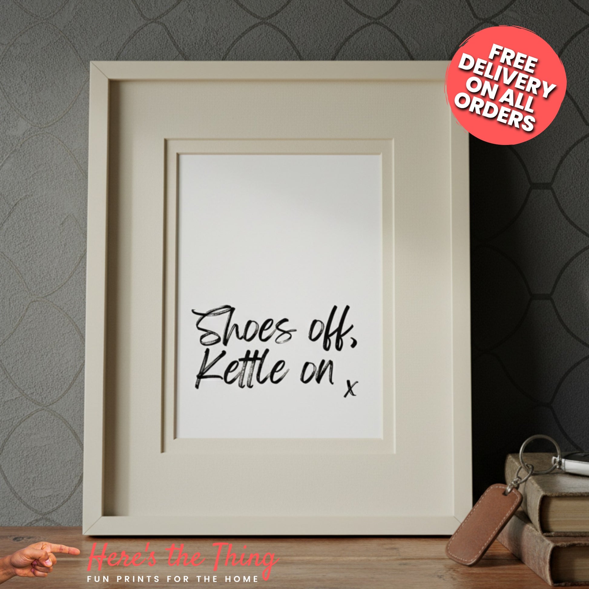 Whether you're decorating your own home or searching for the perfect gift that your friends and family will love, the 'Shoes Off, Kettle On' print is the ideal choice to enhance any wall decor. Plus, with fast and free delivery, your new print will be with you in no time!