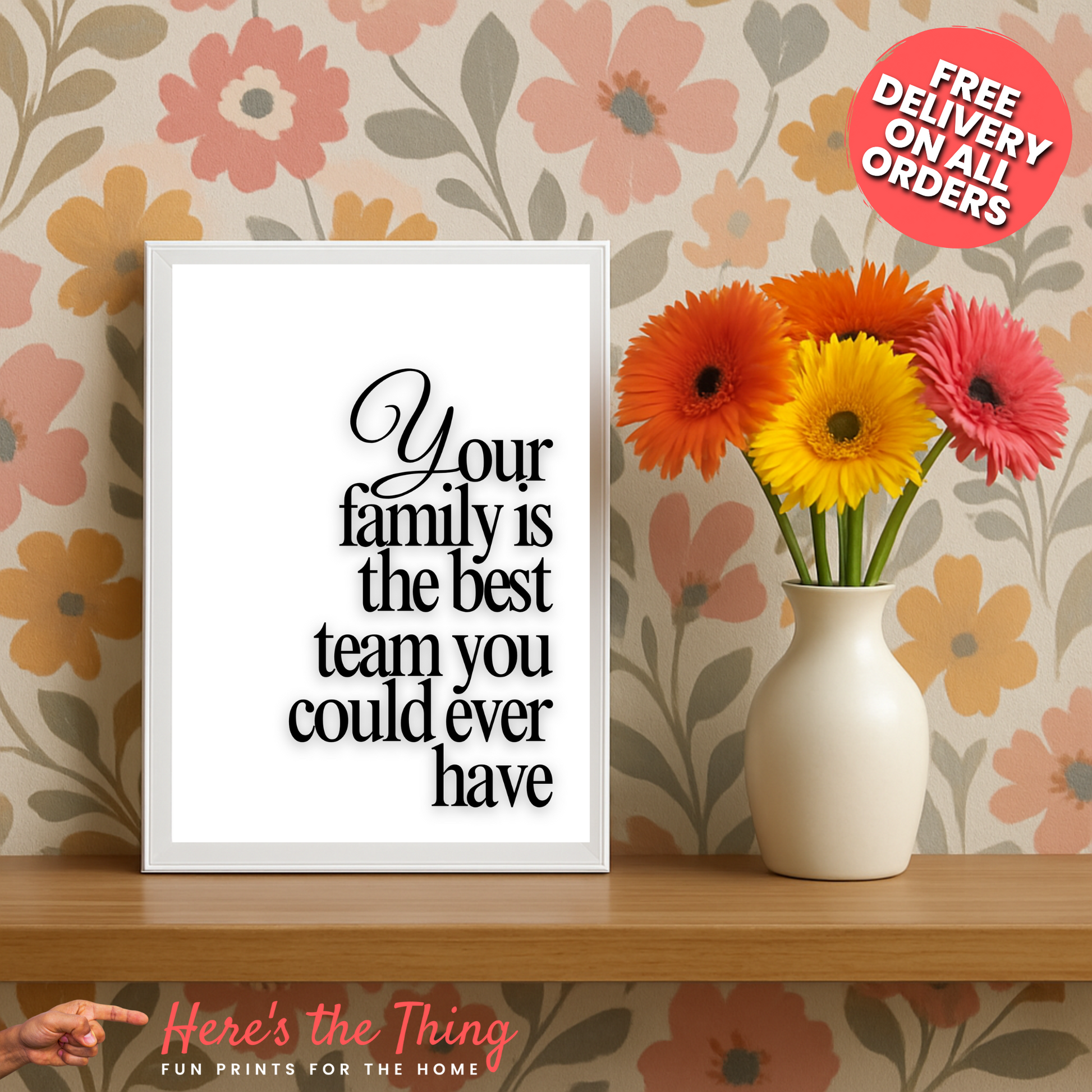 Whether you're decorating your own home or searching for the perfect gift that your friends and family will love, the 'Your Family Is The Best Team You Could Ever Have' print is the ideal choice to enhance any wall decor. Plus, with fast and free delivery, your new print will be with you in no time!